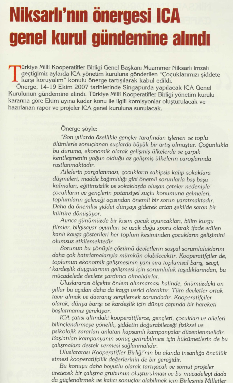 Milli Kooperatifi Birliği olarak uluslararası faaliyetlerimize bir örnek vereyim. 2007 yılında Uluslararası Kooperatifler Birliği’nin Singapur’da yapılan genel kuruluna bir öneri getirdik. Mili Kooperatifi Birliği olarak ICA çatısı altındaki kooperatiflerce; gençleri, çocukları ve aileleri bilinçlendirmeye yönelik, şiddetin doğurabileceği fiziksel ve psikolojik zararları anlatan kampanyalar düzenlenmesini istedik. Toplumda kültür haline gelmekte olan şiddete karşı çocuklarımızı koruyalım dedik. Eğer çocukları şiddete karşı korumazsak o kültürle yetişecekler. Büyüdüklerinde kurumları, ülkeleri yönetecekler. Karşılarına çıkan sorunları önce fikren yenmeye çalışmayacaklar; şiddete başvuracaklar. Biz bunu ICA’ya kabul ettirdik; 2.000’e yakın delegenin katıldığı toplantıda teklifimiz oybirliğiyle kabul edildi. Dışarıdan Türkiye’ye az gelişmiş, bu işlerden anlamayan topluluk olarak bakıyor. Ama bakın ki kaç yıl önce biz şiddeti temelden gündeme getirmişiz.
