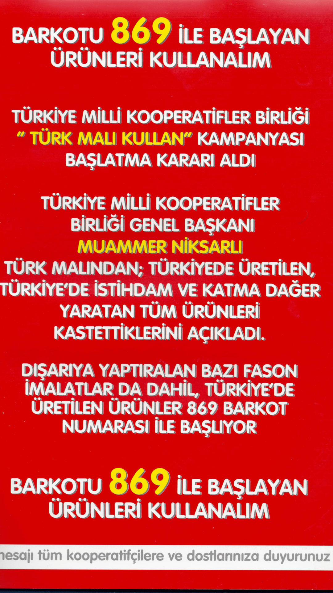 Biz yerli malı kullanmayı unuttuk. Mesela, çocukluğumuzda, gençliğimizde güle oynaya Yerli Malı Haftasını kutlardık, şimdi unutuldu gitti. Türkiye Milli Kooperatifler Birliği olarak  “Türk Malı Kullan” kampanyasını başlattık. Türk malı olarak Türkiye’de üretilen, yurt dışında yaptırılan bazı fason imalatlar da dahil olmak üzere, istihdam ve katma değer yaratan, ülkeye vergi geliri sağlayan, barkod numarası 869 ile başlayan ürünleri kullanalım dedik.